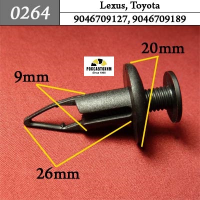 Автомобильный крепёж 0264 автокрепеж для Lexus, Toyota c оригинальным кодом 9046709127, 9046709189 используется на автомобилях Lexus, Toyota для монтажа элементов автомобиля в следующих местах: бампер, защита (различная), отделка (различная) .Характеристики крепежа:Марки и модели: Toyota / Lexus / Toyota Echo (1999-2005) / Camry (1996-2001) / Solara (1998-2002) / Avalon (1995-1999) / Land Cruiser 90 (1996-2008) / Land Cruiser 100 (1998-2007) / Land Cruiser 200 (2007-2012) / Sequoia (2000-2004) / Sequoia (2004-2007) / Land Cruiser Prado (2003-2009) / Sequoia (2000-2004) / Sequoia (2004-2007) / ES300 (1996-2001) / LX470 (1998-2007) / LX570 (2007-) / LX450 (2007-) / GX470 (2002-2009) / IS200 (2001-2005) / IS300 (2001-2005)Место установки: Порог, Салон, Бампер, Надколёсные дуги, Моторный отсек