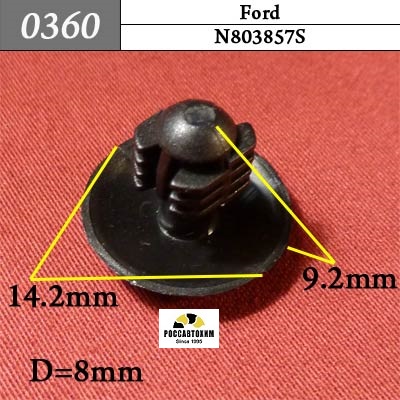 Автомобильный крепёж 0360 автокрепеж для Ford c оригинальным кодом N803857S (N803857-S) используется на автомобилях Ford для монтажа элементов автомобиля в следующих местах: кузов, отделка (различная).Характеристики крепежа:OEM: N803857S. Марка: Ford. Модель: Разные. Место установки: Салон. Элементы: Приборная панель. Дополнительно: Крепление приборной панели (торпеды)OEM: N803857S. Марка: Ford. Модель: Разные. Место установки: Бампер. Элементы: Крепление бампера, деталей бампера. Дополнительно: Крепление бампераOEM: N803857S. Марка: Mercury. Модель: Разные. Место установки: Салон. Элементы: Приборная панель. Дополнительно: Крепление приборной панели (торпеды)OEM: N803857S. Марка: Mercury. Модель: Разные. Место установки: Бампер. Элементы: Крепление бампера, деталей бампера. Дополнительно: Крепление бампера