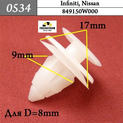 Автомобильный крепёж 0534 автокрепеж для Infiniti, Nissan c оригинальным кодом 849150W000 (84915-0W000) используется на автомобилях Infiniti, Nissan для монтажа элементов автомобиля в следующих местах: двери, отделка (различная) .Характеристики крепежа:OEM: 849150W000. Марка: Infiniti. Модель: QX4 (1996 — 2003). Место установки: Багажник. Элементы: ОблицовкаOEM: 849150W000. Марка: Nissan. Модель: Разные, Cube (1998 — 2002), Pathfinder (1995 — 2005), Terrano (1995 — 2003). Место установки: Багажник. Элементы: ОблицовкаOEM: 849150W000. Марка: Nissan. Модель: Разные. Место установки: Салон. Элементы: ОблицовкаOEM: 849150W000. Марка: Nissan. Модель: Almera (2000 — 2006), Murano (2002 — 2018), Navara (2004 — 2013), Pathfinder (1996 — 2004), Pathfinder (1996 — 2012), Patrol (1997 — 2013), Primera (1998 — 2001), Qashqai (2007 — 2012), Terrano (1996 — 2012). Место установки: Дверь. Элементы: Обшивка двериOEM: 849150W000. Марка: Toyota. Модель: Разные. Место установки: Багажник. Элементы: Облицовка