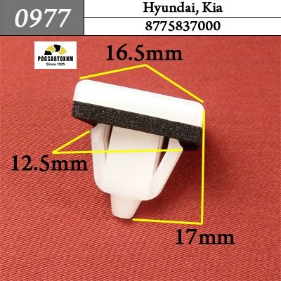 Автомобильный крепёж 0977 автокрепеж для Hyundai, Kia c оригинальным кодом 8775837000 (87758-37000) используется на автомобилях Hyundai, Kia для монтажа элементов автомобиля в следующих местах: молдинги .Характеристики крепежа:OEM: 8775837000. Марка: Kia. Модель: Много моделей, Sorento (2002 — 2009), . Место установки: Порог. Элементы: Накладки порога.OEM: 8775837000. Марка: Hyundai. Модель: Разные. Место установки: Порог. Элементы: Накладки порога.OEM: 8775927000. Марка: Hyundai. Модель: Santa Fe, Tucson, Coupe. Место установки: Дверь. Элементы: Молдинг.