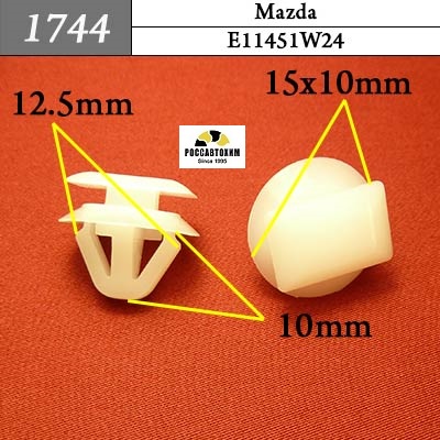 Автомобильный крепёж 1744 автокрепеж для Mazda c оригинальным кодом E11451W24 используется на автомобилях Mazda для монтажа элементов автомобиля в следующих местах: молдинги .Характеристики крепежа:OEM: E11451W24. Марка: Mazda. Модель: CX-7 (2006 — 2012). Место установки: Порог. Элементы: КреплениеOEM: E11451W24. Марка: Mazda. Модель: Tribute. Место установки: Дверь. Элементы: МолдингOEM: E11451W24. Марка: Ford. Модель: Escape. Место установки: Дверь. Элементы: Молдинг