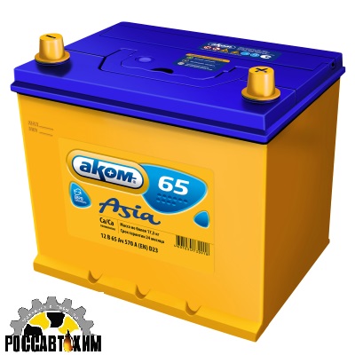 Данная модель аккумуляторной батареи входит в линейку товаров, выпускаемых для автомобилей азиатских марок. Изготавливается по специальной технологии («кальций-кальций»), с учетом актуальных требований производителей транспортных средств.Аккумулятор 6СТ- 65 Аком Asia о.п.(пусковой ток 570Ач) обладает номинальной емкостью в 65 Ач, обратной полярностью. К другим преимуществам устройства можно также отнести — высокую мощность — надежность, стойкость к постоянным, интенсивным нагрузкам, смене температурного режима — стабильность показателя емкости, отсутствие боязни глубокой разрядки — выгодная цена в сравнении с аналогичными товарами на рынке