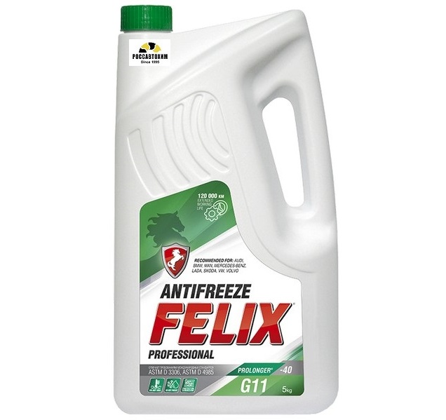 Professional Antifreeze FELIX PROLONGER предназначен для использования во всех легковых и грузовых автомобилях, в том числе высоконагруженных и форсированных, эксплуатируемых в тяжелых климатических и дорожных условиях. ПРЕИМУЩЕСТВА: Обеспечивает 100% защиту двигателя и деталей системы охлаждения от всех видов коррозии, перегрева и переохлаждения Увеличенный пробег без замены охлаждающей жидкости — до 120 000 км Обладает усиленной и пролонгированной защитой металлов (в том числе алюминия), сплавов, резины Исключает возможность образования накипи и отложений Обладает высокими смазывающими свойствами и низким пенообразованием Эффективен при температурах окружающего воздуха от –45°С до + 50°С Обеспечивает быстрый прогрев двигателя до нужной температуры. Обладает превосходной теплопроводностью и теплоемкостью Улучшает работу и продлевает срок службы помпы, термостата, радиатора. Содержит запатентованный многофункциональный пакет антикоррозионных, антикавитационных, антипенных и смазывающих присадок. Изготовлен из моноэтиленгликоля высшего сорта и специально подготовленной деминерализованной воды высшей степени очистки. Неорганический антифриз класса G11 по классификации VW