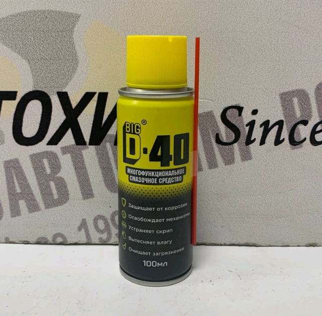 Одно средство — 5 основных функций:1) Защищает от коррозии 2) Освобождает механизмы 3) Устраняет скрип 4) Вытесняет влагу 5) Очищает загрязнения Благодаря своей универсальности, средство рекомендовано для применения в различных сферах: для решения широкого спектра сервисных задач в уходе за автомобилем, в быту, на даче, а также на промышленных производствах.Обладает высокой проникающей способностью.Смазывающие свойства многофункционального средства BIG D-40 / БИГ ДИ-40 позволяют эффективно устранять скрип и заедание механизмов, восстанавливает их работоспособность. Отлично подходит для смазывания петель дверей, резьбовых соединений, шарниров, замков, задвижек, тяг, автомобильных антенн и пр.Защищает от влаги. После высыхания образует антикоррозийное покрытие на обработанной металлической поверхности. Вытесняет воду из самых труднодоступных мест.Очищает от стойких загрязнений.Улучшает электрическую проводимость на контактах и устраняет грязь, следы масла и густой смазки.Освобождает приржавевшие и примерзшие механизмы и обеспечивает плавность их работы.Не содержит силиконов.Преимущества BIG D-40:Полный аналог WD-40, одинаковый состав продукта.Пропеллент CO2 (углекислый газ): Что это дает?Заявленный объем баллона соответствует реальному объему полезного продукта: 400мл означает 400 мл.СO2 обладает меньшей воспламеняемостью, более безопасен при использовании.Баллоны оснащены 360-градусным клапаном распыления, что позволяет распылять средство как в вертикальном, так и в горизонтальном положении баллона.Производство в Турции.Продукция не содержит вредных, токсичных и канцерогенных ингредиентов и тяжелых металлов.Области применения:Для транспортных средств — (автомобиль / мотоцикл / велосипед)Для дачиДля применения в бытуДля промышленных производств и строительстваДля сельского хозяйства