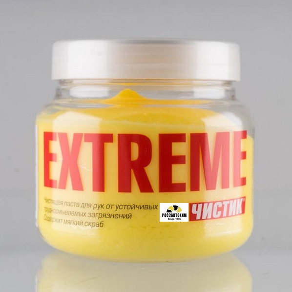 Паста для очистки рук от самых трудносмываемых загрязнений.Удаляет такие загрязнения как:БитумКраскиСмазкиМаслаСажаСодержит мягкий скраб.Чистик EXTREME содержит активные моющие вещества, которые расщепляют сильные загрязнители и выводят токсины из кожи, очищают руки от самых сильных загрязнений.Входящие в состав частицы мягкого скраба отшелушивают остатки грязи и очищают поры от вредных бактерий.После смыть пасту водой. Для лучшей защиты от вредных веществ рекомендуем наносить перед работой крем Чистик ЗАЩИТНЫЕ ПЕРЧАТКИИдеально для очистки от сильных загрязнений.