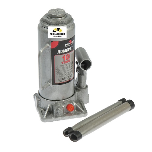 Домкрат гидравлический. Гидравлический бутылочный домкрат представляет собой устройство предназначенное для поднятия грузов. Гидравлические домкраты отличаются компактностью конструкции, простотой обслуживания и надежностью в эксплуатации, позволяя осуществлять плавный подъем груза и его точную остановку на заданной высоте при небольшом рабочем усилии, благодаря высокому передаточному отношению между площадями поперечного сечения цилиндра и плунжера насоса. В отличие от других грузоподъемных механизмов, домкраты располагаются при подъеме под грузом, исключая, таким образом, необходимость использования громозких вспомогательных сооружений. Домкраты данного типа могут использоваться в качестве рабочего элемента в более сложных устройствах, таких как прессы, трубогибы, подъемники и т. пХарактеристики:грузоподъемность, 10твысота подхвата, 230ммвысота подъема, 460ммплощадь опоры, 125х125мм.