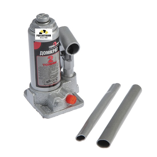 Домкрат гидравлический. Гидравлический бутылочный домкрат представляет собой устройство предназначенное для поднятия грузов. Гидравлические домкраты отличаются компактностью конструкции, простотой обслуживания и надежностью в эксплуатации, позволяя осуществлятьплавный подъем груза и его точную остановку на заданной высоте принебольшом рабочем усилии, благодаря высокому передаточному отношению между площадями поперечного сечения цилиндра иплунжера насоса. В отличие от других грузоподъемных механизмов,домкраты располагаются при подъеме под грузом, исключая, такимобразом, необходимость использования громозких вспомогательных сооружений. Домкраты данного типа могут использоваться в качестверабочего элемента в более сложных устройствах, таких как прессы,трубогибы, подъемники и т. пХарактеристики:грузоподъемность, 2твысота подхвата, 181ммвысота подъема, 345ммплощадь опоры, 95х93мм.
