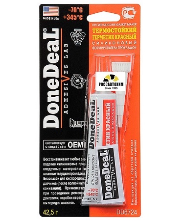 RTV — вулканизирующийся при комнатной температуре. После вулканизации сохраняет эластичность и приобретает водостойкость.Превосходит стандарты O.E.M. (официальные стандарты производителей автомобилей в США).Безопасен для автомобилей, оснащенных кисло-родными датчиками (после полной вулканизации герметика).Рабочий диапазон температур: от -75 C до +345 C.Красный силиконовый формирователь прокладок применяется при проведении ремонтов узлов и агрегатов двигателя и трансмиссии, подверженных повышенным рабочим температурам.Заменяет любые заводские силиконовые прокладочные материалы, штатные твердые и резиновые прокладки.DD6724 может использоваться на современных автомобилях, оснащенных кислородными датчиками (автомобиль может эксплуатироваться через 10-12 часов после ремонта).Устойчив к перепадам температуры и к вибрации.Дополнительное нанесение на штатные прокладки улучшает их термостойкость.Не подвергается воздействию автомобильных жидкостей (не рекомендуется длительный контакт с бензином).Не
