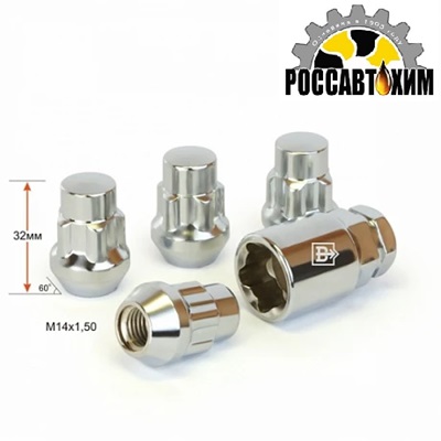 Гайка колесная секретная M14х32х1,5 ( конус c буртиком, открытая,5 лучей 1 ключ)