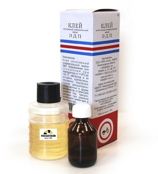 Клей эпоксидный универсальный ЭДП двухкомпонентный (ТУ 2385-024-75678843-2010) — надежное и универсальное средство для склеивания практически любых материалов: металлов, сплавов, стекла, древесины, фарфора, керамики, декоративно-облицовочных материалов и других. (За исключением посуды и предметов, имеющий непосредственный контакт с пищей).Свойства: характеризуется очень высокой механической прочностью, малой усадкой, высокой адгезией к материалам, влагостойкостью, отличными электроизоляционными свойствами.Применение клея ЭДП универсального: В быту для ремонта предметов интерьера, корпусов бытовой техники и акустических систем, ванны, сантехники, баков стиральных машин.Клей ЭДП универсальный отлично подойдет для ремонта спортинвентаря, также применяется для ремонта и изготовления стеклопластиковых поверхностей, ремонта и изготовления бамперов, корпусов лодок, автомобилей, моделирования, производства наливных полов.