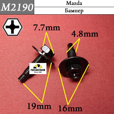 Автомобильный крепёж M2190 Винт на Mazda c оригинальным кодом M2190 — используется на автомобилях Mazda для монтажа элементов автомобиля в следующих местах: бампер .Характеристики крепежа:Вид резьбы: Метрическая резьба (М5)