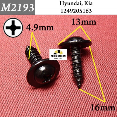 Автомобильный крепёж M2193 Металлический саморез на Hyundai, Kia c оригинальным кодом 1249205163 — используется на автомобилях Hyundai, Kia для монтажа элементов автомобиля в следующих местах: двери, защита (различная) .Характеристики крепежа:Марки и модели: Kia Cadenza (2013- ) / Kia Carens (2006-2012) / Kia Carens (2013- ) / Kia Carnival (2005-2010) / Kia Carnival (2010-2014) / Kia Carnival (2014-) / Kia Ceed (2007-2012) / Kia Ceed (2012- ) / Kia Cerato (2008-2013) / Kia Cerato (2013-2016) / Kia Cerato (2016- ) / Kia Magentis (2000-2005) / Kia Magentis (2005-2010) / Kia Magentis (2010- ) / Kia Optima (2005-2010) / Kia Optima (2010- ) / Kia Optima (2010-2013) / Kia Optima (2013-2015) / Kia Optima (2015-) / Kia Rio (2000-2005) / Kia Rio (2005-2010) / Kia Rio (2011-2015) / Kia Rio (2015-) / Kia Sorento (2002-2009) / Kia Sorento (2009- ) / Kia Sorento (2014- ) / Kia Soul (2008-2011) / Kia Soul (2011-2013) / Kia Soul (2013-2016) / Kia Soul (2016-) / Kia Sportage (1994-2002) / Kia Sportage (2004-2010) / K