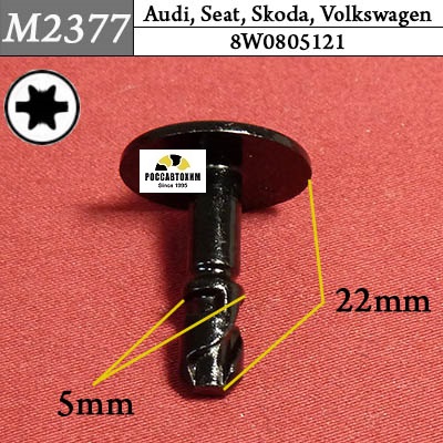 Автомобильный крепёж M2377 Штифт металлический для Audi, Seat, Skoda, Volkswagen c оригинальным кодом 8W0805121 — используется на автомобилях Audi, Seat, Skoda, Volkswagen для монтажа элементов автомобиля в следующих местах: Экран моторного отсека, облицовка задн.бампера в M-стиле (SA715), теплоизоляция, облицовка днища кузова, защитный кожух колесной ниши, экран моторного отсека, облицовка днища, воздуховоды.