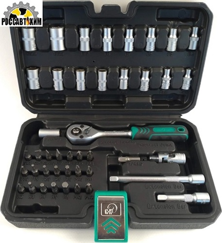 В комплекте:Трещотка 150мм.Удлинитель 50 и 100мм.Адаптер.Переходник для бит.Кардан шарнирный.Головки 4-13мм.Головки Е4-Е8, Е10.Биты SL3, SL4, SL5.5, SL7.Биты PZ1, PZ2, PZ3.Биты PH0, PH1, PH2, PH3.Биты T10, T15, T20, T25, T30.Биты Hex 2-6 мм.