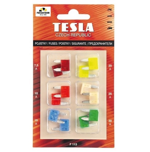 Плоские флажковые предохранители размера «Mini» от производителя Tesla (Тесла, Чехия) представлены набором в количестве 12 штук разного номинала.Предохранитель плоский Tesla F113 Mini (2×7,5А,10А,15А,20А,25А,30А)