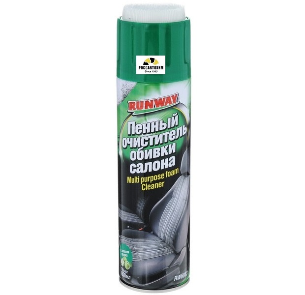 Пенный очиститель обивки салона в аэрозоле с крышкой-щеткой. Предназначен для удаления разнообразных загрязнений и пятен с изделий из ткани, велюра, ковровых покрытий и т. п. Быстро удаляет даже глубоко въевшуюся грязь. Удаляет неприятные запахи и освежает воздух в салоне автомобиля. Придает материалам антистатические свойства. Очиститель RUNWAY удаляет большинство свежих пятен от чая, кофе, молока, соков, крови, губной помады, машинного масла и т.д. Применяется для очистки всего интерьера автомобиля, включая виниловые и пластиковые обивки, панель приборов, молдинги.