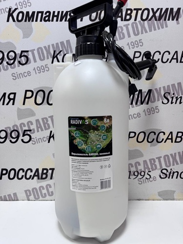 Опрыскиватель RADIVAS 8л помповыйИспользуется для опрыскивания, подкормки и полива растений, кустарников, деревьев средней высоты, картофеля, а также для мытья стен, стекол и других хозяйственных работ. В комплекте: бак, шланг, ремень, трубка брандспойта, заборная трубка, ручка брандспойта.