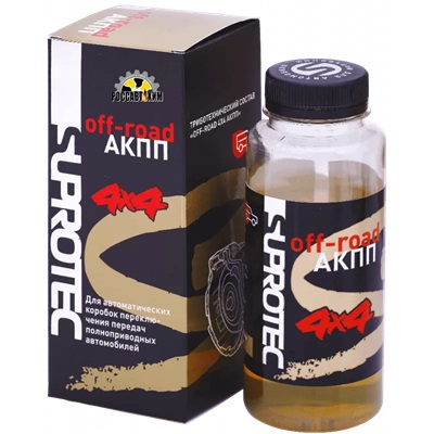 Присадка в масло АКПП внедорожников. Супротек Off-Road 4×4 АКППСостав «АКПП» предназначен для восстановления характеристик и продления срока службы автоматических коробок переключения передач и вариаторов тяжелых внедорожников и полноприводных автомобилей. Подходит для любых моделей автоматических КПП с любым типом и маркой трансмиссионной жидкости.В автоматических (с гидротрансформатором) коробках передач применение состава позволяет:устранить рывки при переключении передач за счет восстановления работы масляного насоса снизить гул и вибрацию при работе агрегата снизить расход топлива В вариаторах, восстановление поверхности конусов позволяет:восстановить натяжение цепи, устранить провалы в передаче мощности при наборе скорости продлить срок службы агрегата.Состав «Off-road 4×4 АКПП» не влияет на работу фрикционов, поскольку оказывает воздействие только на стальные поверхности трения, и не воздействует на композитные материалы. Триботехнический состав не меняет химических и физических сво
