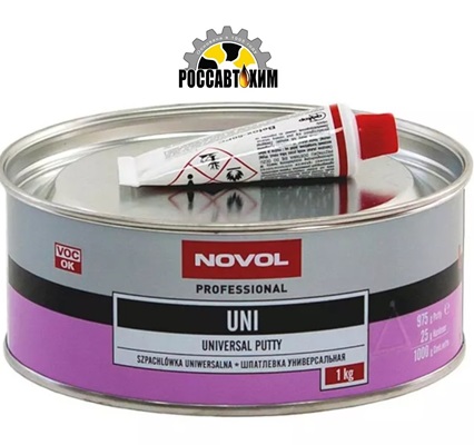 Универсальная полиэфирная заполняющая автомобильная шпатлевка новол Novol Uni Universal Putty, относительно прочная и с небольшой эластичностью, рекомендуемая в основном для механической обработки, а также для применения на небольших поверхностях или для небольших ремонтов. Хорошо наносится тонкими слоями шпателем и заполняет мелкие неровности и царапины. Материал обладает прекрасной адгезией к разным видам оснований, в том числе к стали, алюминию, полиэфирным ламинатам, акриловым грунтам и старому ЛКП, также широко применяется при малярных и отделочных работах по дереву, бетону и пластмассе. Не наносить непосредственно на реактивные грунты. Воздушная сушка при 20 °С. около 20-30 минут, температурная сушка при 60 °С. около 10 минут. Пропорция смешивания с отвердителем 2-3%. Смешивать с отвердителем малыми частями непосредственно перед нанесением, время жизни готовой смеси (при смешивании с отвердителем) около 4-6 минут при 20°С. Минимальная температура нанесения +10 °С. Шпатлевка поставляется в комплекте с от