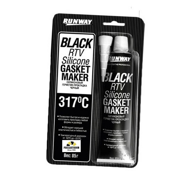 Универсальный силиконовый герметик-прокладка RUNWAY (чёрный) предназначен для для быстрого и надёжного формирования автомобильных прокладок любых размеров и формы. Герметик RUNWAY заполняет мельчайшие трещины, обладает хорошей адгезией, эластичностью и упругостью. Применяется для любых автомобильных прокладок, клапанов, термостатов, впускных коллекторов, трансмиссии. Герметик RUNWAY можно использовать для крепления неподвижных стекол. Герметик RUNWAY отлично подходит для использования в быту. Диапазон рабочих температур от лично подходит для использования в быту. Диапазон рабочих температур от -62 до +317°C. Герметик RUNWAY устойчив к воздействию атмосферных осадков и химикатов, не подвергается коррозии.Применение: Очистите и обезжирьте поверхность от загрязнений. Нанесите герметик-прокладку сплошным слоем по всему участку поверхности. Соедините детали, не допуская их скольжения. Герметик схватывается в течение 1-го часа, отвердевает через 10 часов, конечная прочность герметика достигается за сутки. Пос
