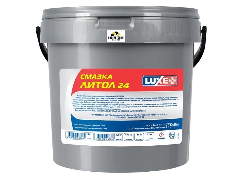 Смазка LUXE литол-24 арт.709, 9,5кг LUXOIL Литол-24 — антифрикционная многоцелевая водостойкая смазка, предназначена для применения в узлах трения колесных, гусеничных транспортных средств и промышленного оборудования, судовых механизмов, а также рекомендуется для подшипников качения и скольжения всех типов, шарниров, зубчатых и других передач. Имеет высокую температуру плавления, небольшую испаряемость, достаточный предел прочности, что позволяет применять эту смазку при температурах +110-140 °С. Она сохраняет работоспособность и при температуре минус -40 °С. Luxoil Литол-24 отличается хорошей стабильностью и противозадирными свойствами, является хорошим консервантом и надежно защищает металл от коррозии.