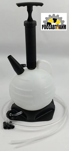 Устройство для слива масла, 6 л. Изделие предназначено для слива отработанных масел из различных видов техники. В комплект входит : ёмкость 6 л., вакуумный насос , главный шланг который крепится к ёмкости , три дополнительные трубки-насадки: D4 — 1 м., D6 — 1 м., D8 — 1 м. (крепятся к основному шлангу посредством переходника). С их помощью можно откачивать моторное масло через отверстие щупа. Носик предназначен — для слива откаченного масла из ёмкости. ЗАПРЕЩАЕТСЯ использовать устройство для откачки жидкостей обладающих высокой летучестью (бензин), высоко щелочные и высоко коррозирующие жидкости.